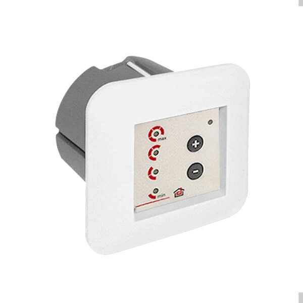 Der 12 Stufen-Regler kann je nach Belieben an der Wand angebracht werden. Grundsätzlich gibt es zwei verschiedene Montagemöglichkeiten, denn Sie können sich zwischen einer Unterputz-Variante, bei der ein großer Teil des Gerätes in der Wand versteckt bleibt, und einer Aufputz-Variante entscheiden, die ein wenig mehr hervorsteht. Standardmäßig haben die zwei Varianten eine weiße Kunststoff-Ummantelung. Sie können die Unterputz-Variante jedoch auch optional mit einer Front aus Edelstahl erhalten.