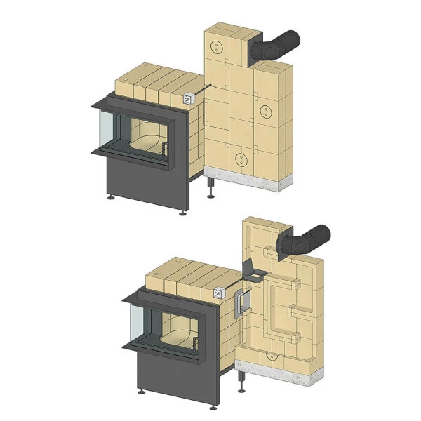 - Innenausbau: Komplettfeuerraum Typ D plus 90° mit Massivblende, Nachheizfläche aus Brula-Modulzugsteinen mit vorbereiteten Putzöffnungen, Anheizklappe für den kurzen Anheizweg