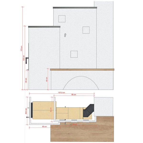 In dieser Anlage ist der kleine Feuerraum Typ A plus geplant, hier mit der großen Heiztür GT-A 08 für bessere Sicht aufs Feuer. Das Zugsystem ist hinter dem Feuerraum angeordnet, mit einem Sturzzug und liegenden Zügen zum Schornsteineingang. Das Design 9 kann auch freistehend geplant werden, dadurch würde sich die stündliche Strahlungswärmeleistung erhöhen. An die Anbauwand gebaut, beträgt diese ca. 2,6 kW stündlich.