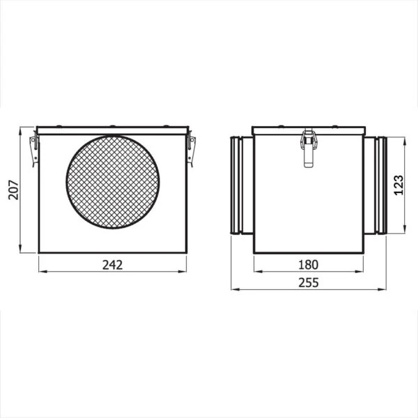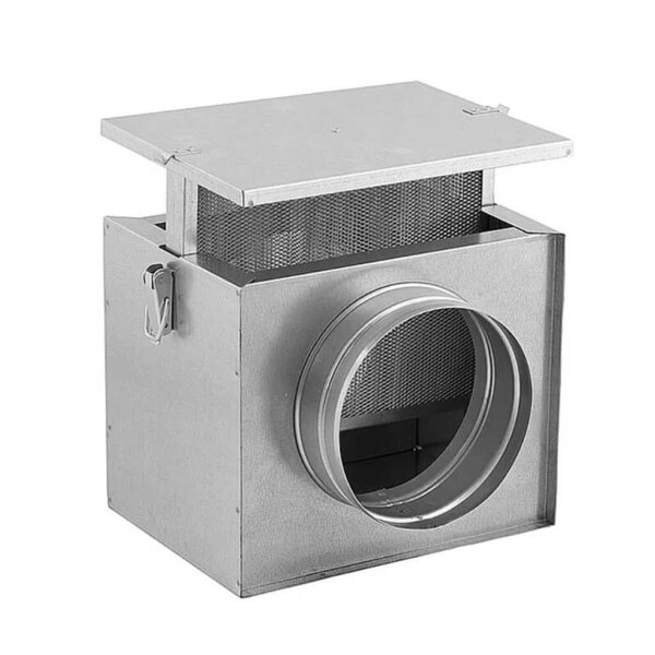 Die Filterbox unisoliert für Lüftungsrohr ist aus verzinktem Stahl und misst 200 × 200 mm. Die Box eignet sich für Lüftungsrohre mit dem Durchmesser 125 mm oder 150 mm.