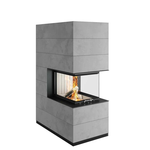 Die Tür, gleichzeitig Sichtscheibe, lässt sich nach oben wegschieben. So müssen Sie bei der Planung keinen extra Platz berechnen, den eine seitlich klappbare Tür benötigen würde. Die Glaskeramik ist hitzebeständig und in U-Form gestaltet, sodass sie sich um das Feuer herum schmiegt. Daher können Sie von drei Seiten aus den Blick in die Flammen wagen. Die Scheibenelemente sind großzügige 72 + 51 +72 cm breit und 50 cm hoch.