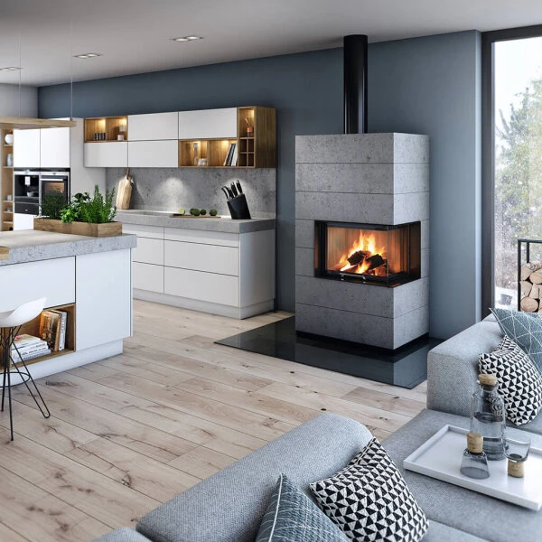 Die moderne Betonverkleidung des Spartherm SIM Varia 2Rh-4S begeistert durch klare Formsprache und Kantenführung, gibt gleichzeitig aber Wärme gut und gleichmäßig an die Umgebung ab. Der Brennraum besteht aus hitzebeständiger Schamotte, die besonders lange Hitze speichern kann.