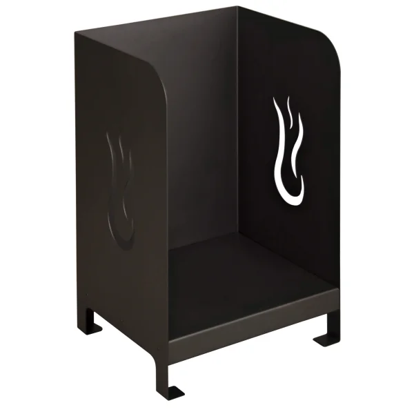 Optisch macht dieses Kaminholzregal einen sympathischen Eindruck, wartet es doch mit einer gemütlichen in Schwarz-Glimmer gehaltenen Oberfläche auf. Einen exklusiven Charakter bekommt es durch die Verzierung mit einem stilisierten Flammenmotiv.
