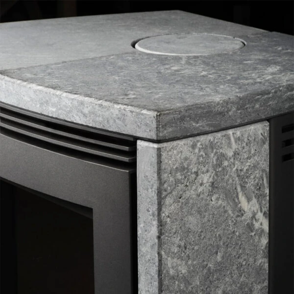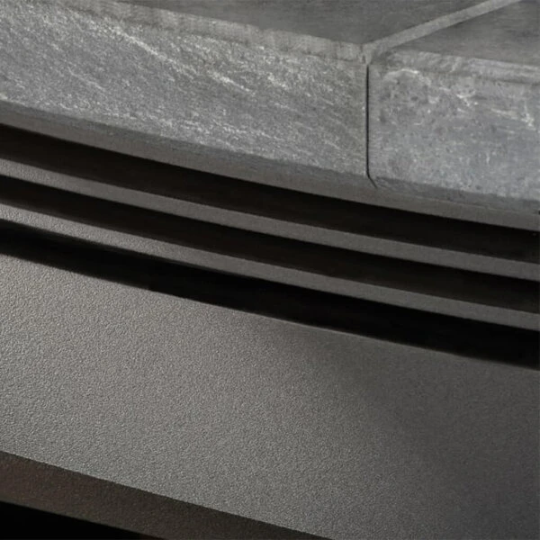 Der hochwertige, gussgraue Stahlkorpus des Kaminofens Meltemi bildet eine harmonische Einheit mit der schön gemaserten Verkleidung aus grauem Speckstein. Der Naturstein verleiht dem Meltemi optisch das besondere Etwas und speichert zugleich einen Teil der abgegebenen Wärme. Diese gibt er selbst nach Erlöschen der Feuers noch langanhaltend und gleichmäßig an den Wohnraum ab.