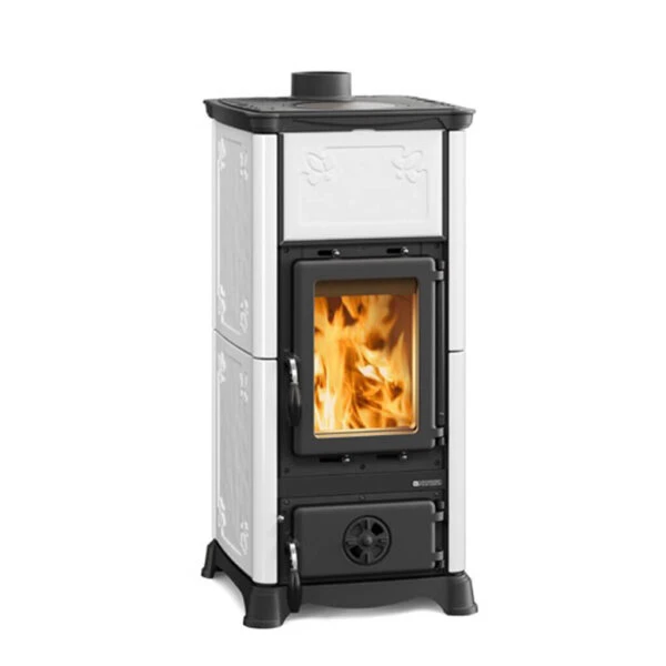 Tür, Sockel und Kopf des Kaminofens La Nordica Emiliana sind aus robustem, emaillierten Gusseisen gefertigt. Diese Linie setzt sich auch im Feuerraum fort, welcher ebenfalls mit Gusseisen ausgekleidet ist. Das Äußere des Kaminofens wurde mit hochwertigen Majolika-Keramikkacheln besetzt. Diese überzeugen mit einer erstklassigen Wärmeleitungs- sowie Wärmespeicherfähigkeit. Die Keramikplatten sind mit einer schönen Verzierung versehen, die trotz verschnörkeltem Muster ganz zeitlos daherkommt. Sie haben dabei die Wahl zwischen einer Komposition aus schlichter weißer oder bordeauxroter Majolika-Keramik. On the top ist eine praktische Warmhalteplatte im Kaminofen La Nordica Emiliana verbaut. Auf dieser können Sie Speisen und Getränke erwärmen und warmhalten.