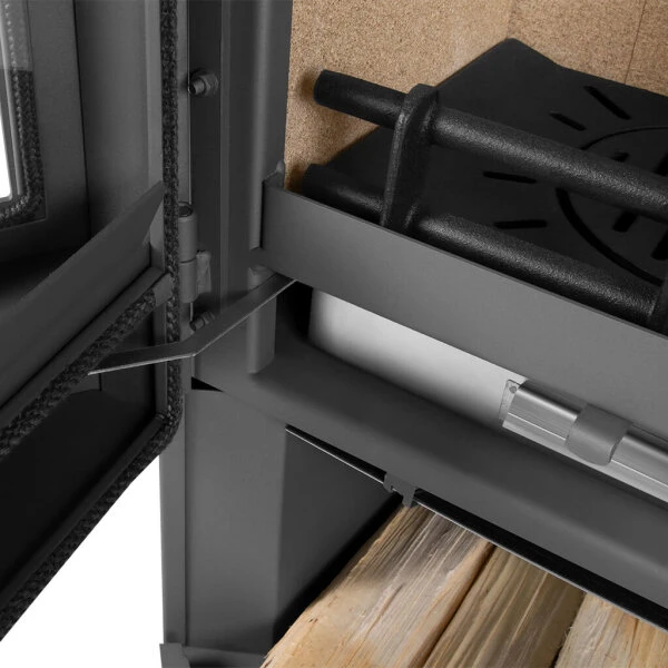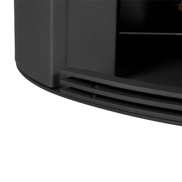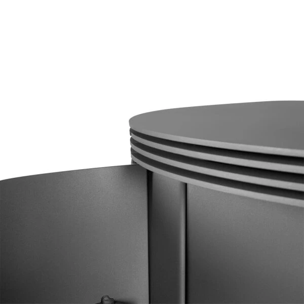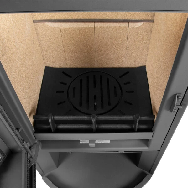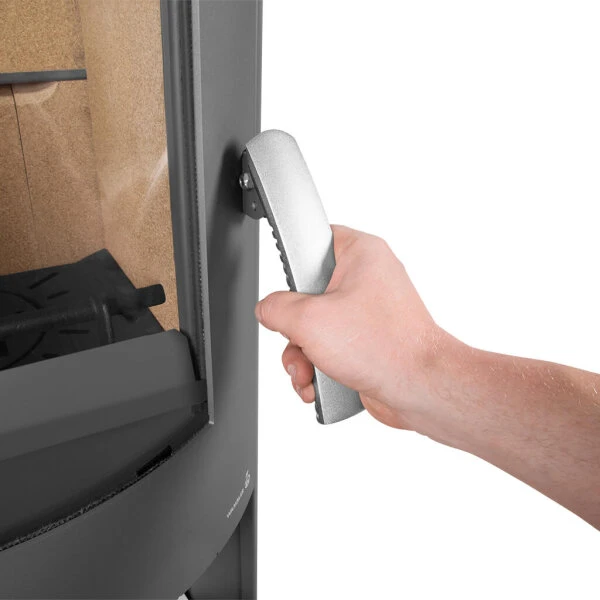 Der doppelwandige Korpus und die Ofentür bestehen aus Stahl in Gussgrau. In die gebogene Tür mit seitlichem Griff ist eine runde Sichtscheibe aus Robax-Glaskeramik eingelassen, die aufgrund ihrer Krümmung auch seitliche Einblicke gestattet. Somit sind die Rona-Modelle ideal für die praktische Aufstellung in einer Raumecke, zumal die Sicherheitsabstände aufgrund der doppelwandigen Konstruktion geringer ausfallen. Der Stahlkorpus ermöglicht, dass sich die Wärme schnell im Raum verteilt.