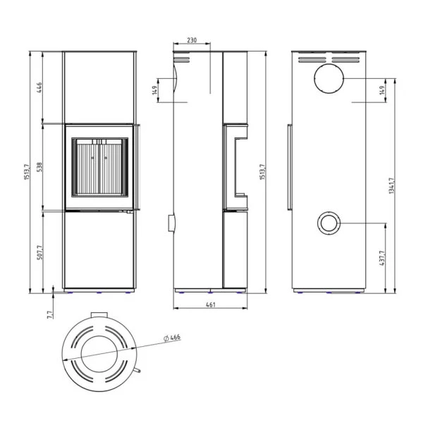 Die an die Form des Kaminofen Wamsler Rook angepasste Vollglas-Türe mit automatischer Türverriegelung und ihr schmaler Edelstahlgriff untermalen die Gestalt des Ofens gekonnt. Das integrierte, unsichtbare Holzlagerfach passt sich ebenfalls nahtlos in die Optik ein und erlaubt die platzsparende Unterbringung von Brennstoff direkt am Einsatzort. Auch die Einhand-Luftschieber-Regelung befindet sich hinter der Vortür dieses Fachs. Das Rauchrohr mit 150 mm Durchmesser kann oben oder hinten am Ofen angeschlossen werden. Die Maße des Ofens betragen (HxBxT) 1513 x 466 x 466 mm.