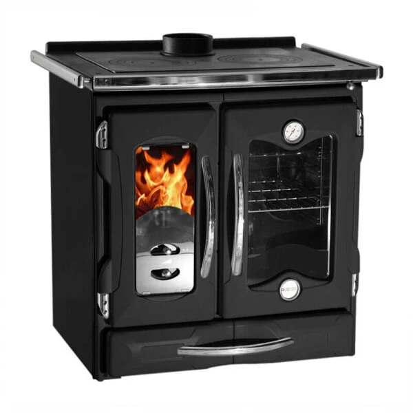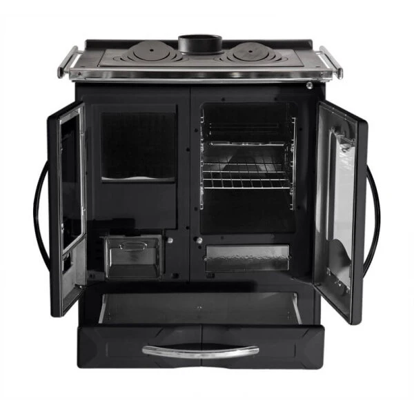Das emaillierte Backrohr umfasst 55 l Volumen und ist 307 mm breit, 418 mm hoch und 430 mm tief. Darin befinden sich verschiedene Einschubebenen für ein Backrost oder -blech. Damit Sie zu jeder Zeit die Temperaturen im Auge behalten können, ist über der Backofenscheibe ein Thermometer in die Tür eingelassen. So reicht ein kurzer Blick auf den Herd aus, um zu wissen, wie heiß es im Inneren ist. Die Temperatur können Sie über die Brennstoffauflage regeln. Die Kochplatte des La Nordica Mamy besteht aus Gusseisen und leitet daher die Wärme sehr gut. Außerdem ist Gusseisen ein Material mit hoher Widerstandskraft und traditionell sehr langlebig.