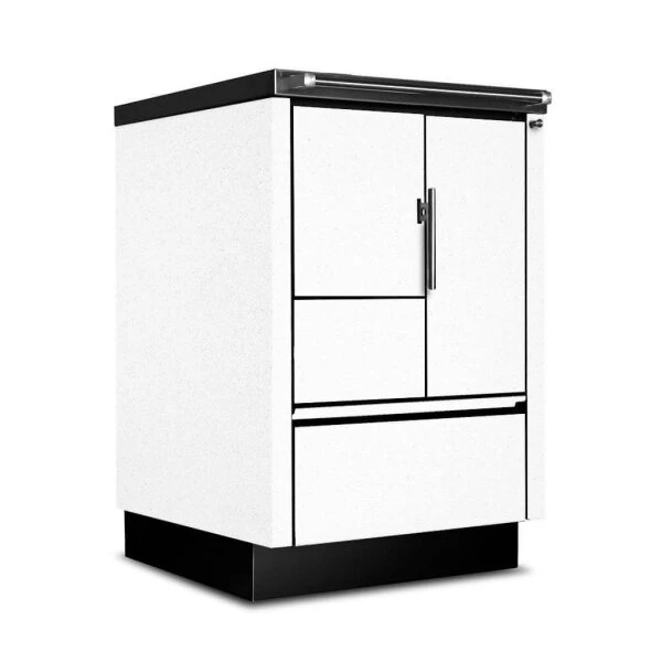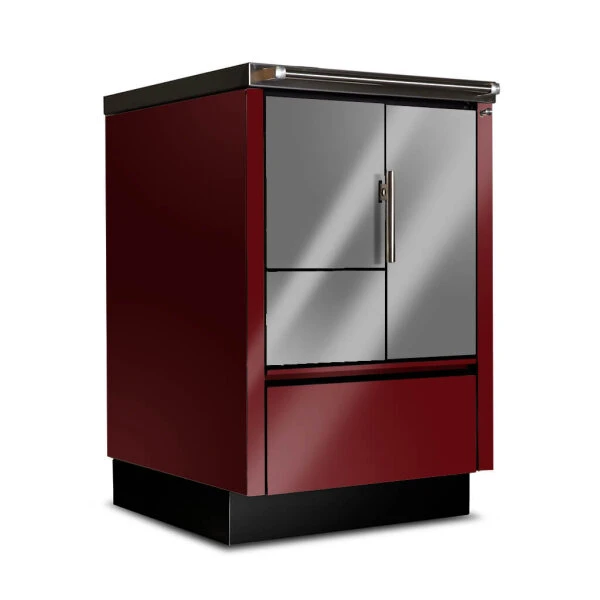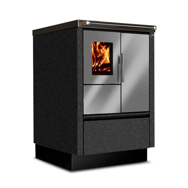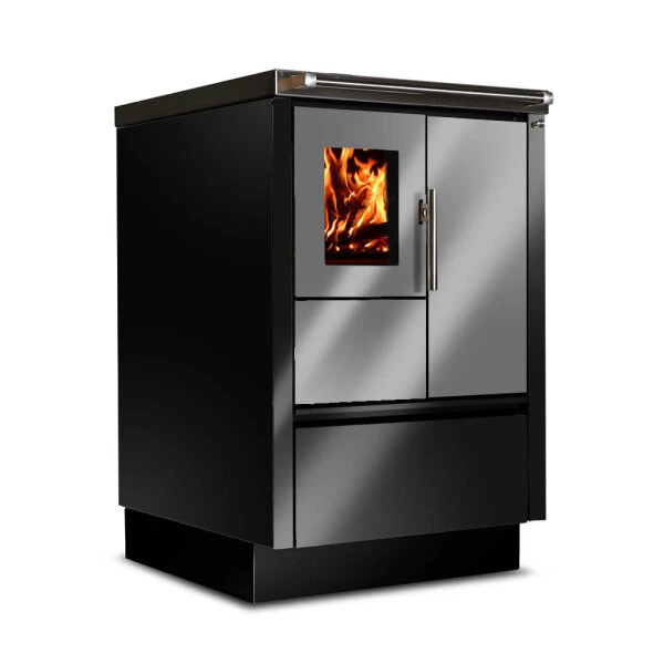 Optisch wird der Beistellherd von zeitlos modernen Tönen dominiert. Der Korpus ist in Weiß oder komplett in Edelstahl erhältlich. Ein optionales links- oder rechtsseitiges kleines Sichtfenster, wahlweise mit dreifacher Verglasung, schenkt Ihnen dabei an der Vorderseite einen guten Einblick in den Feuerraum. Ein Holzschubfach im unteren Sockelbereich bietet genügend Platz für Ihren Holzvorrat. Aber auch in einer Einbauküche macht der 55 cm schlanke Küchenofen Tyrola TR_B 55 stets eine gute Figur. Die entsprechenden An- und Einbauelemente sind bei Bedarf ebenfalls erhältlich. Somit zeugt der Küchenkamin gleichermaßen von Modernität, Effizienz und Nostalgie.