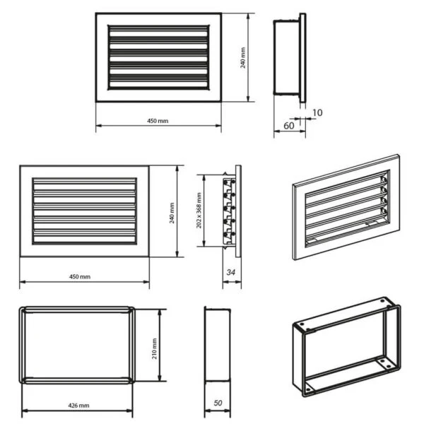Das Lüftungsgitter hält Temperaturen bis 180 °C stand und ist in folgenden verschiedenen Größen erhältlich: 190 x 170 / 200 x 145 / 220 x 220 / 240 x 170 / 325 x 170 / 325 x 195 / 450 x 170 / 450 x 220 / 450 x 240 mm. So können Sie das Lüftungsgitter genau auf Ihren Bedarf abstimmen.