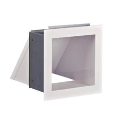 Die weiße, pulverbeschichtete Box wird mit einem verzinkten Einbaurahmen in der Wand versenkt. Dieser ist verstellbar, damit Sie auf unterschiedliche Wandstärken reagieren können. Zur Lieferung gehört auch das passende, nach oben offene Luftleitblech. Dieses verhindert nicht nur unerwünschte Einblicke, sondern sorgt auch für schräg abgeleitete Ventilation. Da das Luftleitblech auch Weiß pulverbeschichtet ist, bildet es eine optische Einheit mit der 170 x 170 mm großen Luftbox.