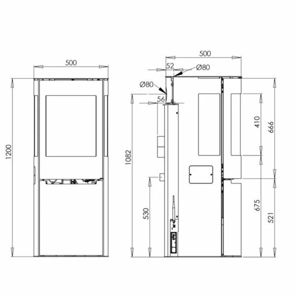 Mit Maßen von 120 x 50 x 56 cm (HxBxT) fügt sich der Pelletofen Aduro P5 Lux mit seinem zeitlosen Erscheinungsbild ideal in Ihren Wohnraum ein. Die luxuriöse, gewölbte Glastür gibt dem Gerät eine tolle Optik. Direkt unter der Brennkammer befindet sich der Pellettank, der insgesamt 14 kg Holzpellets aufnehmen kann und dank seiner Platzierung im Gerät unkompliziert befüllbar ist. Das Rauchrohr kann mit 80 mm Durchmesser entweder oben oder hinten am Ofen angebracht werden. Dank dem eingebauten Rauchgebläse arbeitet der P5 Lux unabhängiger vom Schornsteinzug.