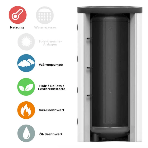Der Pufferspeicher 200 passt hervorragend als Ergänzung zu einer vorhandenen Anlage, wie beispielsweise für eine Wärmepumpenanlage. Auch besteht die Möglichkeit an einem der vielen Flansche eine Heizpatrone einzubauen, um mit Hilfe von elektrischem Strom aus einer Photovoltaikanlage warmes Heizungswasser zu produzieren. Durch die geringe Größe hat dieser Speicher auch geringe Abmessungen. Mit einer Höhe von nur 1207 mm ohne Isolierung und einem Durchmesser von 500 mm passt er durch fast jede Tür und kann überall im Haus aufgestellt werden.