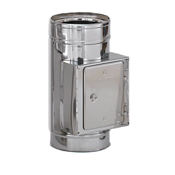 Der Putztüranschluss ist Bestandteil des Schornsteinsystem ICS aus dem Hause Schiedel. Das Element besteht aus witterungsbeständigem Edelstahl und wird unterhalb des Rauchrohranschlusses montiert. Durch die eckige Putztür kann der Schornstein gereinigt werden. Die integrierte Rußschutztür schützt die Umgebungsluft vor austretenden Rußpartikeln. Die Kondensatsperre des Putztüranschlusses verhindert ein Austreten von Kondensat beim öffnen. Der Putztüranschluss ist mit den Innendurchmessern 130 / 150 / 180 / 200 / 230 / 250 / 300 mm verfügbar und kann mit allen Elementen gleicher lichter Weite kombiniert werden. Er ist nur für den trockenen Betrieb, also mit Festbrennstoffen geeignet.