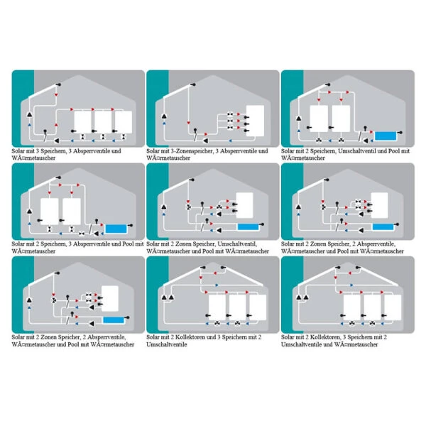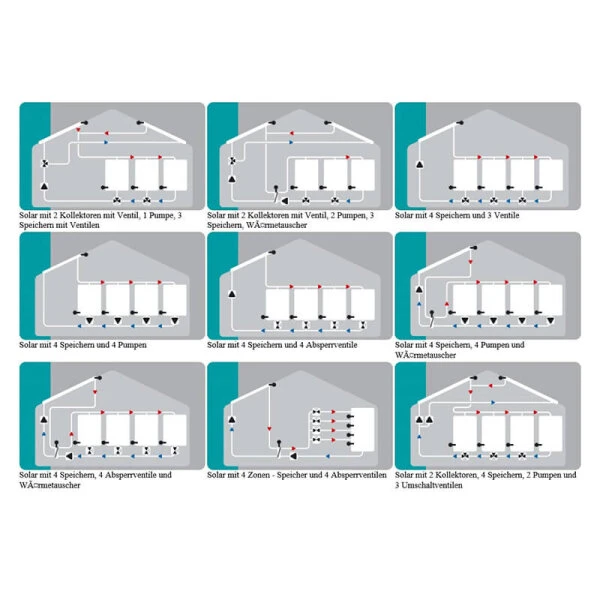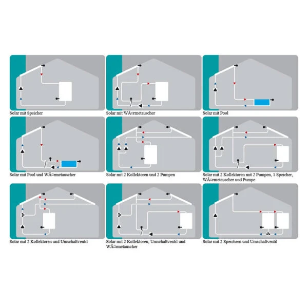 Die Sorel XTDC ist für viele verschiedene Anlagenvarianten einsetzbar. Insgesamt ist die Regelung mit 8 Fühlereingänge ausgestattet. Besitzt zusätzlich noch zwei Eingänge für Durchfluss- oder Drucksensoren. Weiter besteht die Möglichkeit noch ein Raumthermostat anzuschließen. Bei den Ausgängen hat der Hersteller Sorel nicht gespart. Mit 6 Ausgängen 230 VAC plus einem potenzialfreien Ausgang kann der Regler viele Komponenten in Ihrer Solaranlage ansteuern. Weiter können Sie bis zu zwei Energiesparpumpen drehzahlgeregelt mit dem bekannten PWM-Signal ansteuern.