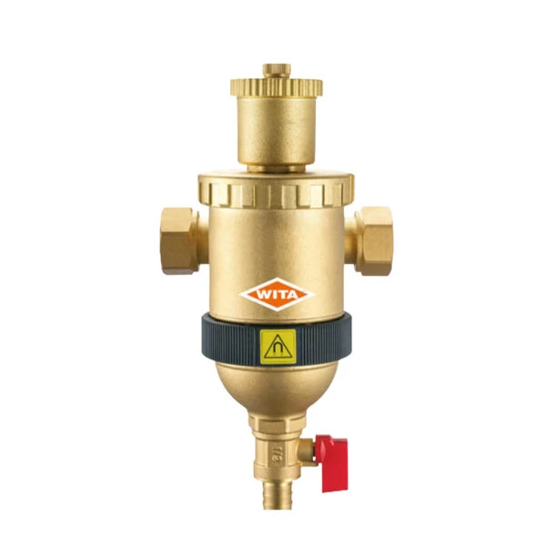 Der WITA Trap Schlamm-, Magnetit-, und Mikroblasenabscheider schützt die Pumpen und Ventile Ihrer Heizungsanlage vor Schmutzablagerungen und Verunreinigungen und sorgt somit für einen zuverlässigen Betrieb. Der Schlammabscheider aus Messing dient der effizienten Beseitigung von Schmutzpartikeln (größer 5µm) aus Heizungs-, Ku¨hl- und Solaranlagen. Sowohl eisenhaltige Verunreinigungen (Magnetit) als auch nicht-magnetische Verunreinigungen sowie Schlämme aus dem Heizungswasser (nach VDI 2035), die in alten sowie neuen Anlagen entstehen, werden herausgefiltert. Eine einfache, schnelle und sichere Entleerung des Schlammabscheiders ist bei laufendem Betrieb möglich.