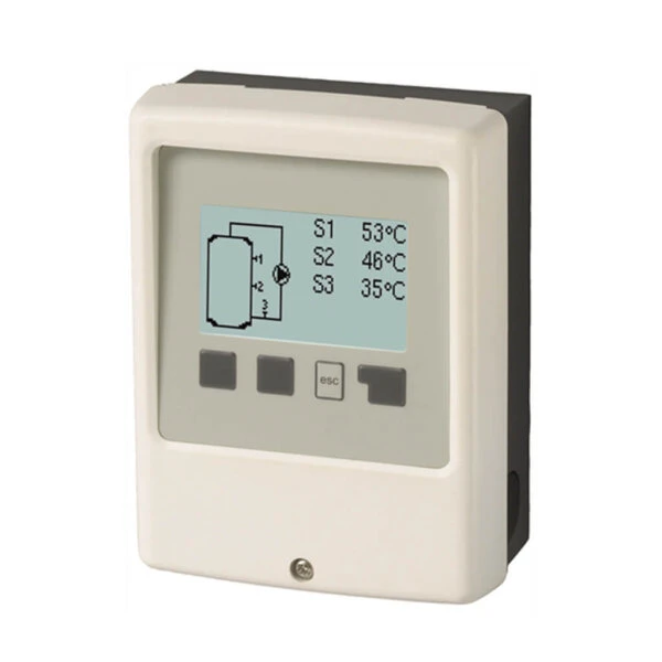Das Display ist groß genug um umfangreichen Text und Grafiken anzuzeigen. Dabei ist die Bedienung des Reglers einfach und fast selbsterklärend. Der Regler wird über vier große Tasten bedient. Im Standby Modus wird das Anlagenschema gezeigt. Die Pumpe ist animiert, wenn diese läuft. Weiter bekommen Sie alle Temperaturen im System angezeigt. Somit können Sie den Anlagenstatus schnell erfassen und prüfen.